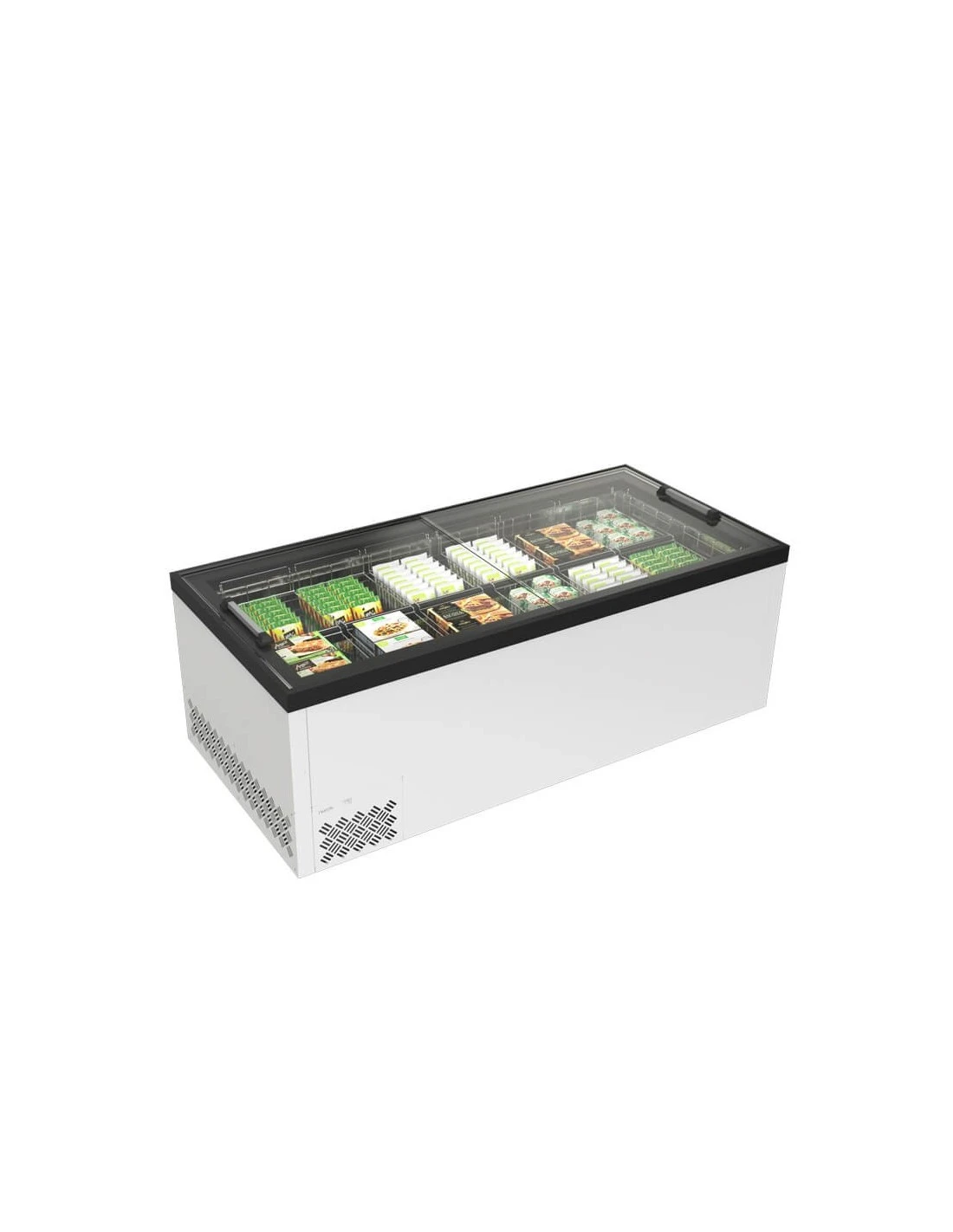 Isola surgelati negativa con vetri scorrevoli con un alta efficienza energetica grazie a 90 mm di isolamento di poliuretano iniettato SENZA HCFC/CFC. Questa isole vetrate negative vetro piano scorrevole ha una refrigerazione statica e una capacità di 783 litri. La sua temperatura di lavoro che va da -25°C a -18°C. Questa isola congelatore viene spesso usato nei supermarket e minimarket.