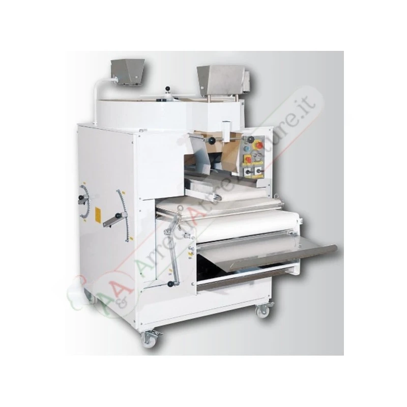 Caratteristiche: ha 2 motori indipendenti onde poter far funzionare anche una sola parte di macchina. È completa di 2 sfarinatori inox, motorizzati indipendenti. Ha il cassetto inox per il recupero dello spolvero. Produzione: 1200 pezzi/ora max. Può essere accoppiata ad una spezzatrice volumetrica o a depressione, per un lavoro completamente automatico.