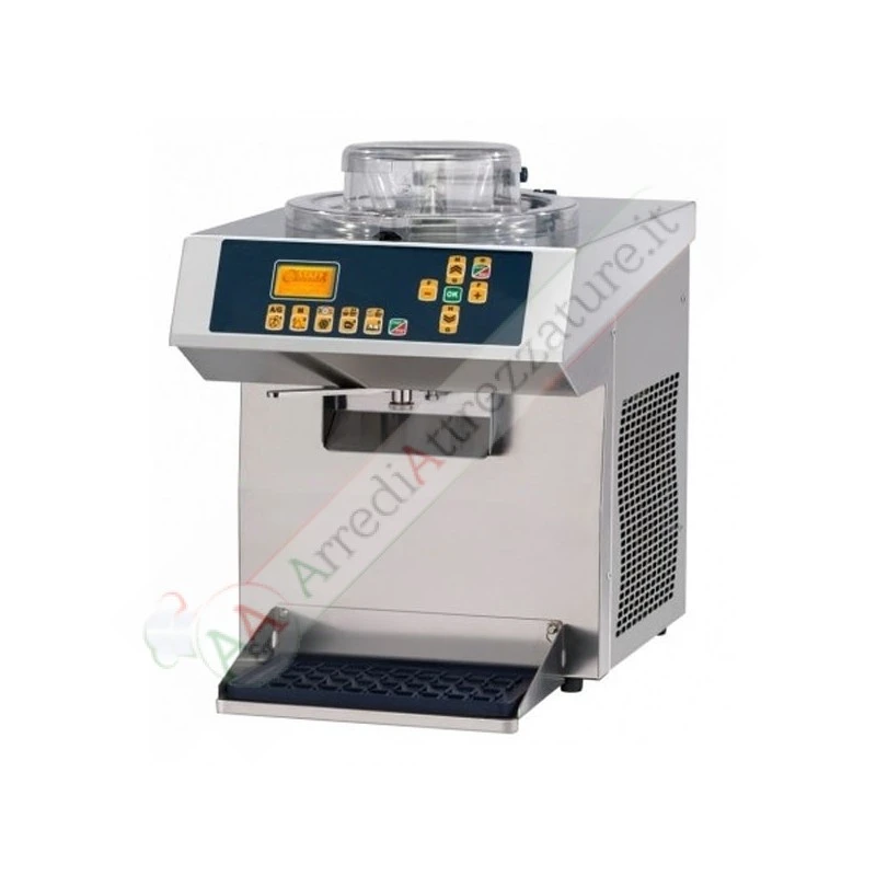 Mantecatore da banco elettronico con estrazione automatica da 15 LT/h. Elettronico, inverter technology. Doppio coperchio per l’inserimento degli ingredienti con l’agitatore in movimento. Coperchio trasparente per controllare la trasformazione delle preparazioni. Elevato gradimento estetico; angoli arrotondati per una maggior sicurezza sul lavoro. Agitatore con lama raschiante in polietilene (PE) a lunga durata. Tutte le parti a contatto con la miscela o il gelato sono in acciaio inox e in materiale atossico facilmente accessibili e smontabili per la pulizia. Variatore di velocità agitatore con elevate perfomance, per riprodurre l’agitazione manuale. Display grafico multilingue da 2,5 pollici. Cruscotto in posizione ergonomica. Segnalazione anomalie acustiche e visive. Rubinetto a filo del fondo della vasca. Oltre 50 programmi personalizzabili dall’utente. Porta di connessione al PC per configurazione parametri scheda. Completa integrazione tra inverter ed elettronica. Mensola di appoggio. Vasca di produzione verticale permette di controllare la trasformazione della miscela durante tutta la fase di lavoro. Funzioni modulabili per milioni di possibili ricette. Controllo temperatura con sistema PID (proporzionale integrale derivativo). Arresto agitatore gestito con centralina di sicurezza certificata. Supporto.