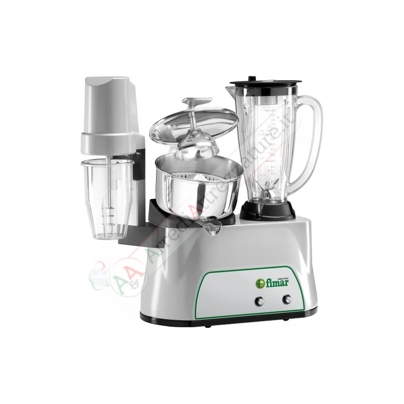 Macchine per realizzare contemporaneamente più lavorazioni. Struttura in lega leggera di alluminio verniciato – motori indipendenti. GP3SFF: composto da spremiagrumi, frullatore con bicchiere da 1,5 Lt. in lexan e frullatore frappè con bicchiere in lexan.
