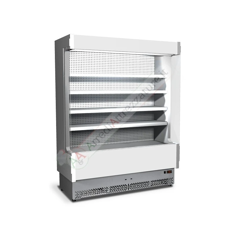 Murale espositivo a refrigerazione ventilata dalla struttura compatta ma con ampia superficie espositiva che la rende adatta alla piccola, media e grande distribuzione. La tecnologia, il design e la produzione “Made in Italy” garantiscono la qualità del prodotto facile da installare e da pulire e a basso consumo energetico nonché a basso impatto ambientale: la vasca è infatti realizzata senza l’uso di CFC. Possibilità di personalizzazioni su richiesta. La vetrina è dotata di spalle termoformate e coibentate con fianco in vetro temprato, pannello comandi elettronico, sbrinamento a fermata, illuminazione superiore con lampada a neon e tenda notte autoavvolgente manuale. Dispone inoltre di 4 ripiani in lamiera post-verniciata bianca atossica regolabili in altezza e dotati di portaprezzo e valvola R404A/R507. Disponibile anche nella versione in acciaio inox.