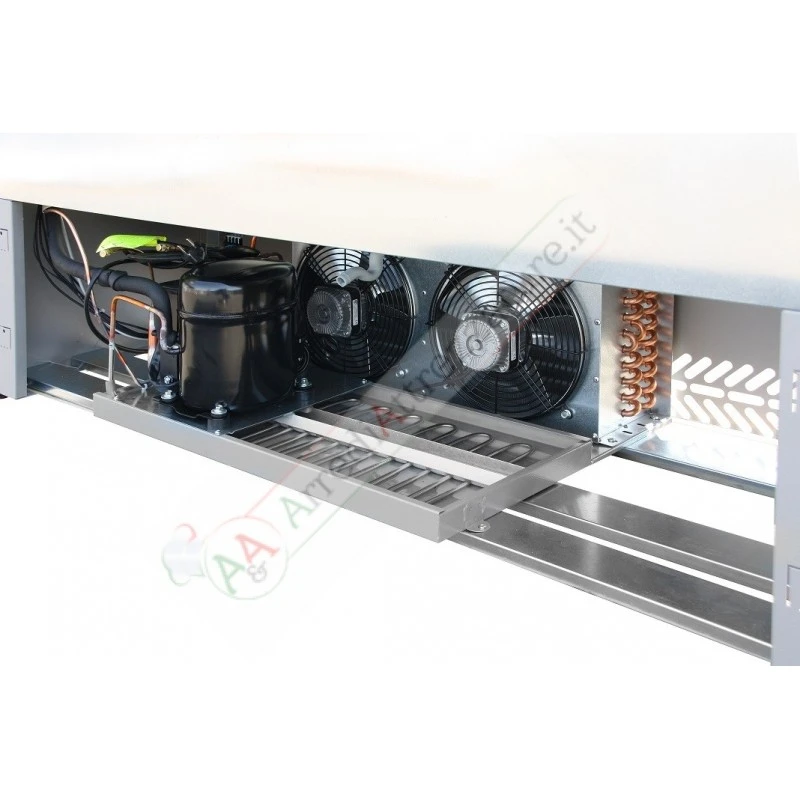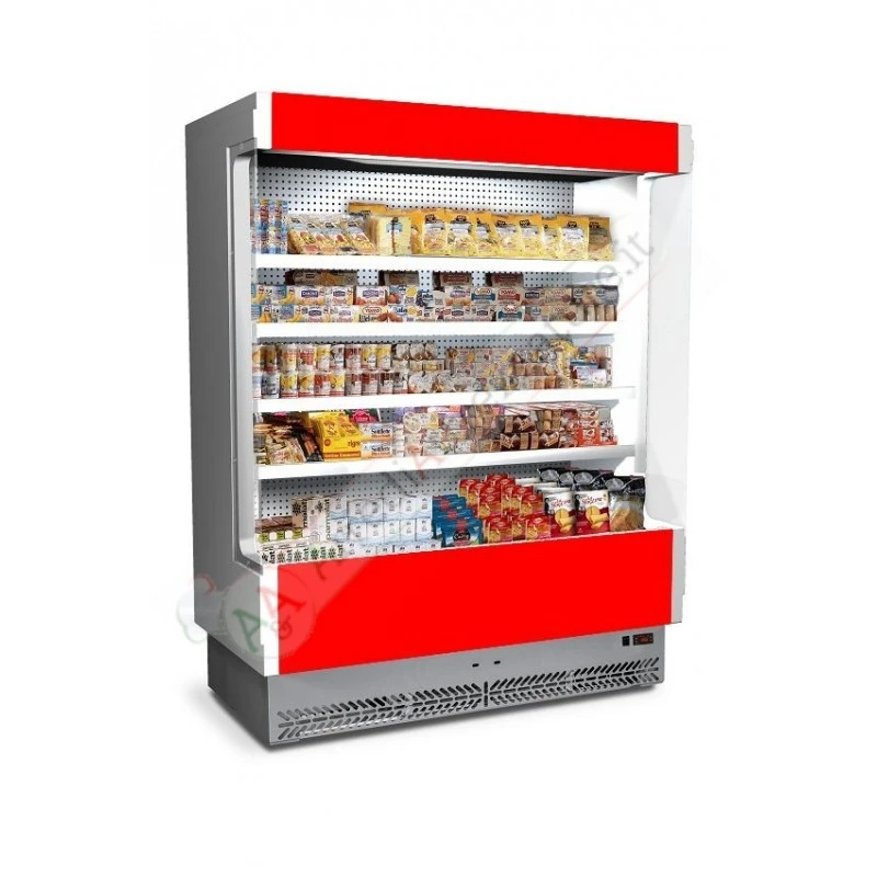 Murale espositivo 80 cm di profondità a refrigerazione ventilata dalla struttura compatta ma con ampia superficie espositiva che la rende adatta alla piccola, media e grande distribuzione. La tecnologia, il design e la produzione “Made in Italy” garantiscono la qualità del prodotto facile da installare e da pulire e a basso consumo energetico nonché a basso impatto ambientale: la vasca è infatti realizzata senza l’uso di CFC. Possibilità di personalizzazioni su richiesta. La vetrina è dotata di spalle termoformate e coibentate con fianco in vetro temprato, pannello comandi elettronico, sbrinamento a fermata, illuminazione superiore con lampada a neon e tenda notte autoavvolgente manuale. Dispone inoltre di 4 ripiani in lamiera post-verniciata bianca atossica (3 nella versione Frutta e Verdura) regolabili in altezza e dotati di portaprezzo, con sistema di recupero ed evaporazione automatica dell’acqua di condensa tramite serpentina inox e valvola R404A/R507.