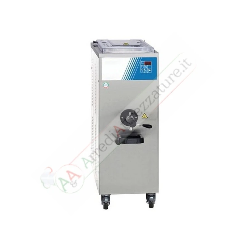 Coperchio trasparente (per poter osservare perfettamente il procedere delle fasi della pastorizzazione). Il trattamento termico della miscela, il riscaldamento a 85°C e successivo raffreddamento fino a 4°C sono eseguiti rapidamente. Le temperature possono essere regolate nei seguenti campi: riscaldamento da +60°C a +90°C, raffreddamento da +20°C a 0°C. Fase di riscaldamento miscela, impostazione di fabbrica + 85°C. Fase di raffreddamento miscela, impostazione di fabbrica +4°C. L’elettronica, semplice e funzionale, seleziona automaticamente i tempi di mantenimento del riscaldamento secondo la temperatura di pastorizzazione prescelta. L’elettronica, inoltre, ha una memoria “intelligente” che ripete automaticamente il ciclo di pastorizzazione in caso di interruzione dell’alimentazione elettrica. Il rubinetto di erogazione con lavaggio incorporato garantisce, dopo ogni prelievo e al termine del funzionamento, una costante e perfetta igiene. La vasca prevede un pozzetto di scarico o è inclinata per permettere la totale fuoriuscita della miscela. Tutte le parti in contatto con il prodotto sono smontabili senza utensili per la manutenzione giornaliera.