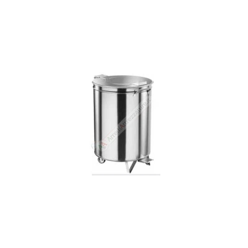 Portarifiuti carrellato con struttura a forma cilindrica in acciaio inox, completo di coperchio stampato, ruote piroettanti. Pedale.