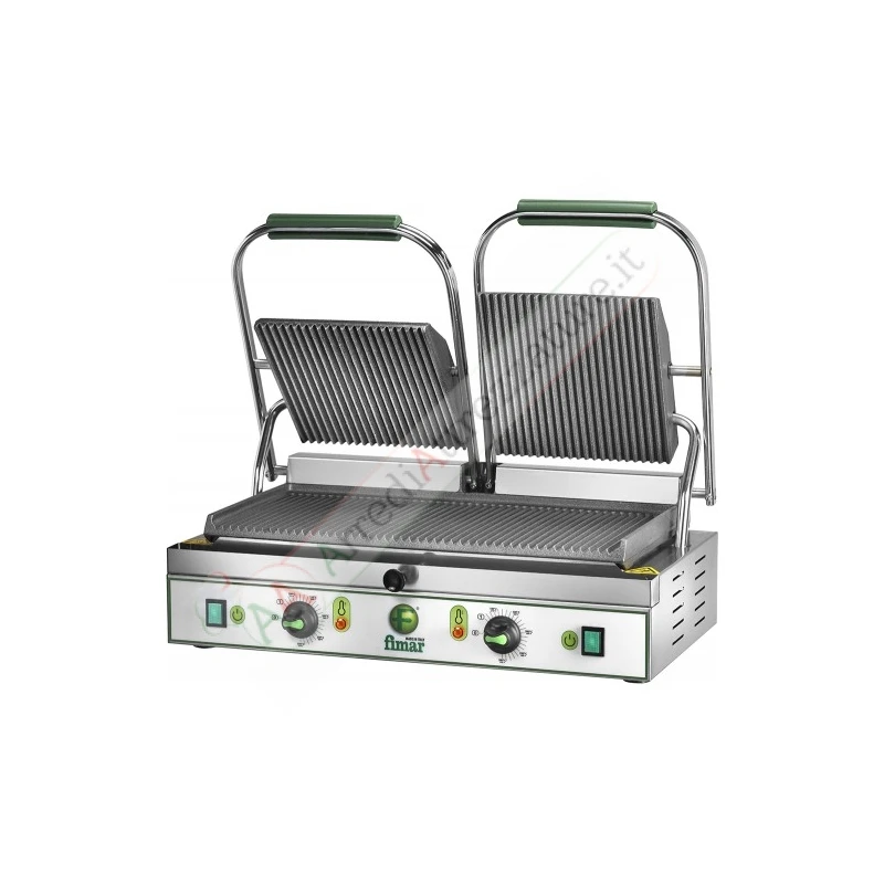 Struttura in acciaio inox – piastra di cottura in ghisa sabbiata, in grado di mantenere a lungo la temperatura – resistenze a contatto con le piastre per garantire una migliore conducibilità – termostato 0÷300 °C – termostato di sicurezza – piastra superiore autobilanciata