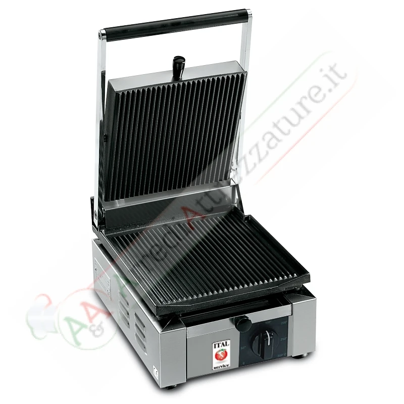 vetrificato, per garantire igienicità e inataccabilità da acidi e sali oltre ad una assoluta resistenza all’ossidazione. Permette una cottura rapida e sicura di svariati tipi di alimenti come carni, pesce, uova, verdure, formaggi; ideale per toast farciti, panini caldi di vario spessore e dimensione.