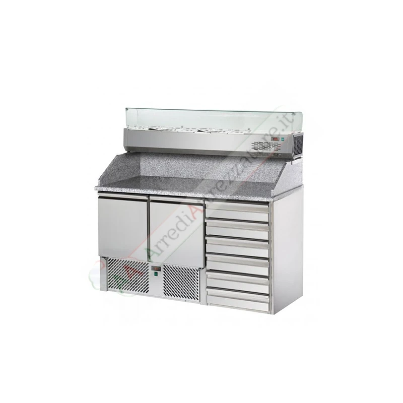 Saladette 2 porte, 6 cassetti, piano in granito e Vetrina Refrigerata.