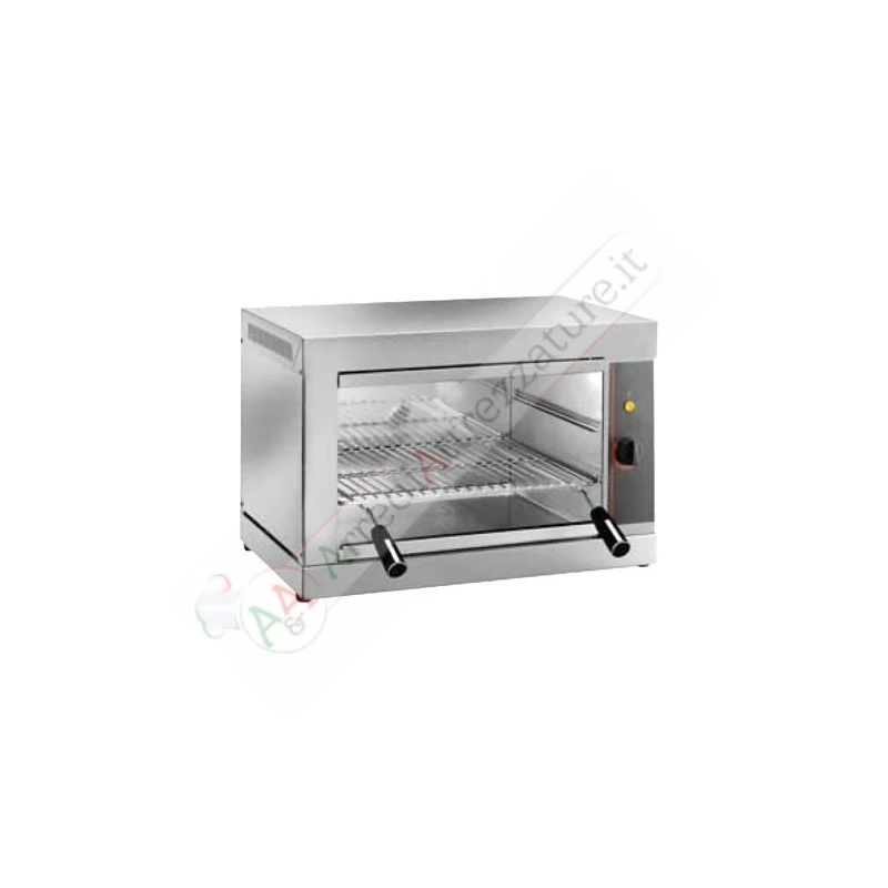 Corpo in acciao inox, regolazione posizione griglia su 2 livelli (Mod. SAL), resistenze corazzate, cassetto raccolta residui di cottura, griglia superiore per mantenere calde le pietanze, temporizzatore.