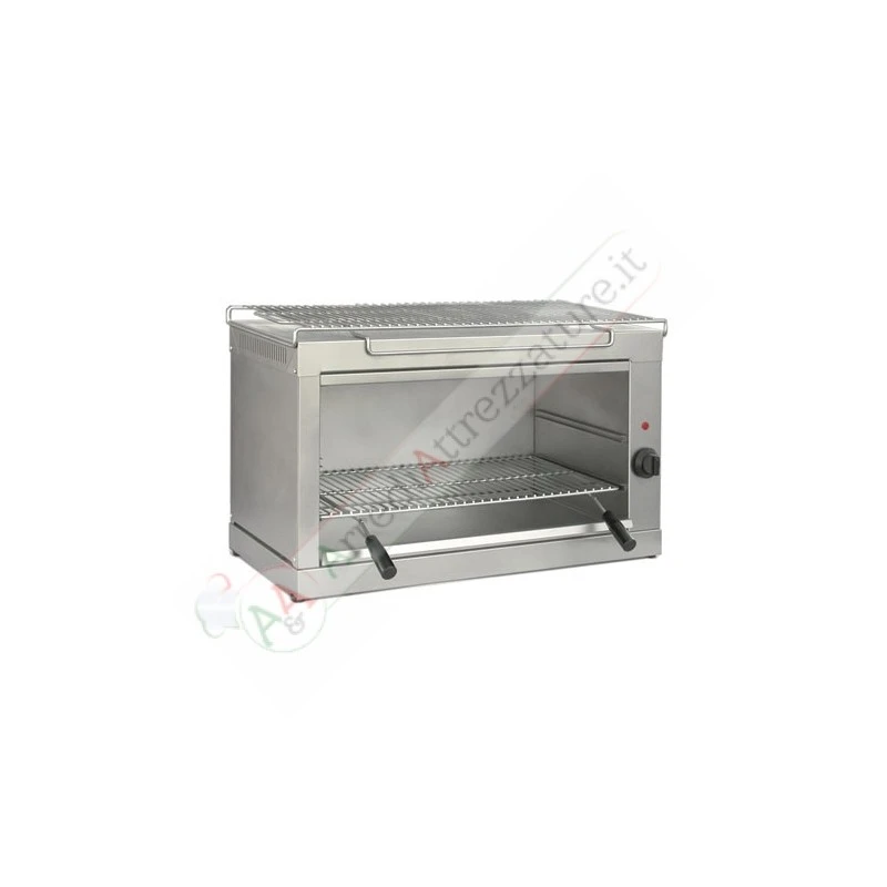 Corpo in acciao inox, regolazione posizione griglia su 2 livelli (Mod. SAL), resistenze corazzate, cassetto raccolta residui di cottura, griglia superiore per mantenere calde le pietanze, temporizzatore.