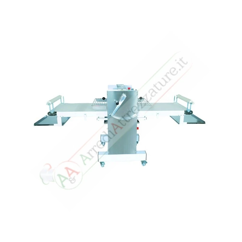 Macchina ideale per laminare qualsiasi tipo di pasta ed in particolare la pasta sfoglia. I cilindri inox sono regolabili e la grande escursione in apertura facilita la cilindratura di grossi pezzi. Un dispositivo di fermo permette di stabilire lo spessore finale della sfoglia. È montata completamente su cuscinetti a sfere. I tappeti girano ad una velocità variata grazie ad una speciale frizione. I dispositivi antinfortunistici, il contenitore spolvero e i cassetti recupero sono in acciaio inox. L’impianto elettrico è a bassa tensione. L’inversione di marcia è possibile grazie ad un comodo doppio comando manuale. A fine lavoro è possibile chiudere i tappeti verso l’alto. La macchina è completa di 2 mattarelli.