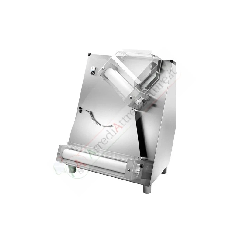 Macchina per stendere impasti di pizza, pane, piada, focacce, ecc. Struttura interamente in acciaio inox – rulli in resina alimentare – leva di regolazione spessore su entrambe i gruppi per realizzare diverse forme. Sistema con micro di sicurezza, posto sul coperchio protezione rulli superiori, che permette il funzionamento solo a coperchio chiuso con la stessa funzionalità della pedaliera.