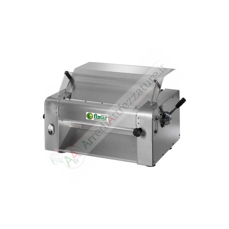 Macchina per stendere impasti all’uovo, pizza e piada. Struttura interamente in acciaio inox – rulli in acciaio inox lucidati a specchio – pomello di regolazione spessore ultimo passaggio – microinterruttore su coperchio di protezione rulli.
