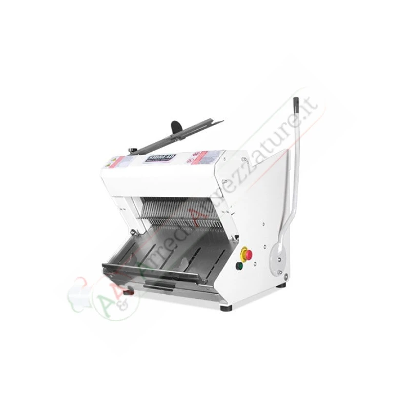 Taglio mediante doppi telai di lame con movimento assiale alternativo. In dotazione cassetto raccogli briciole, piani e spingipane in acciaio inox. Spingitore a leva o con maniglia.