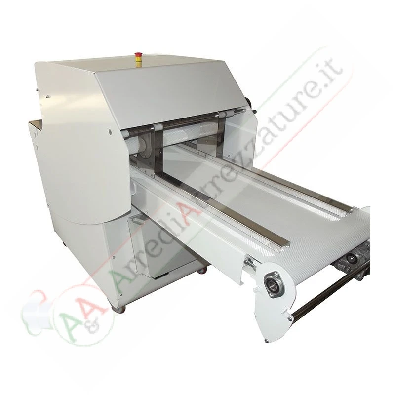 Taglierina pane automatica per uso artigianale-industriale. Struttura in acciaio montata su una base con ruote.