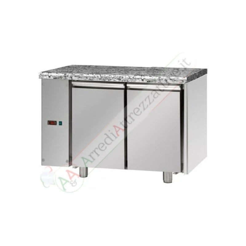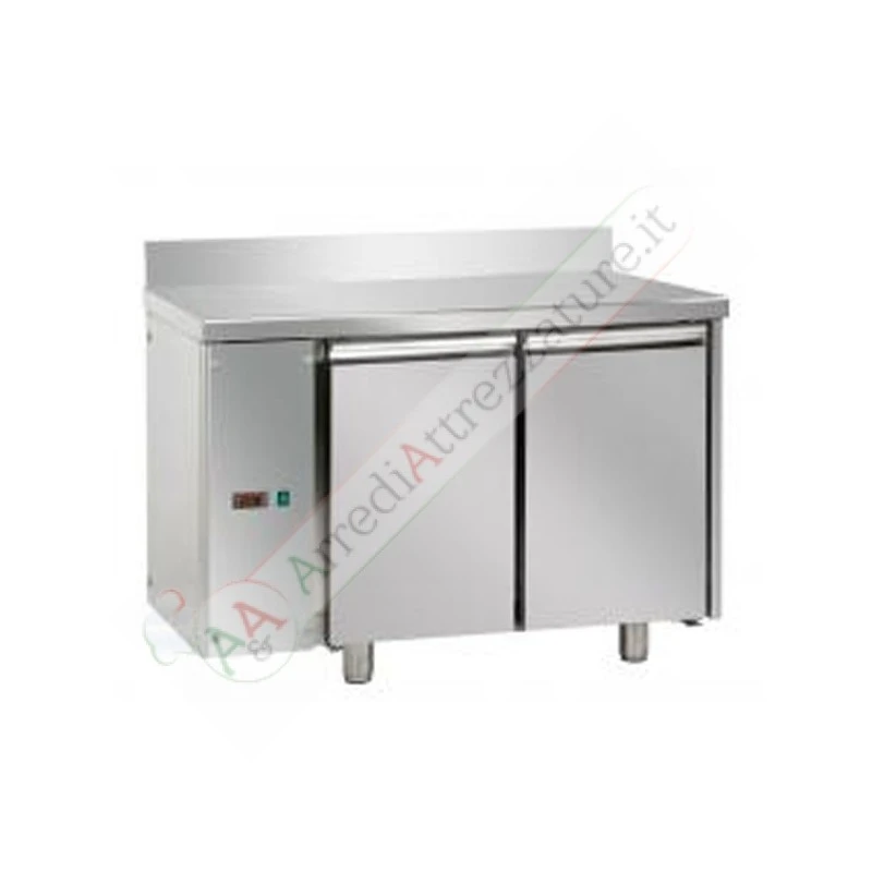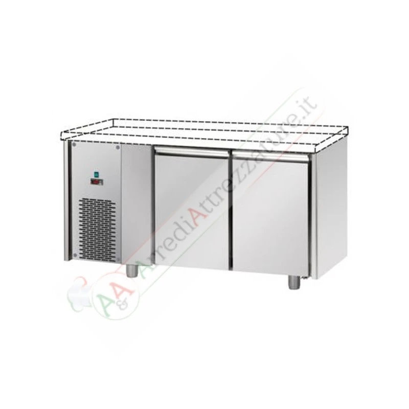 Tavolo congelatore GN I/I predisposto per unità frigorifera remota a bassa temperatura a sinistra con 2 porte e piano in acciaio inox con varianti con alzatina, senza piano e piano in granito.