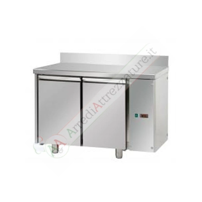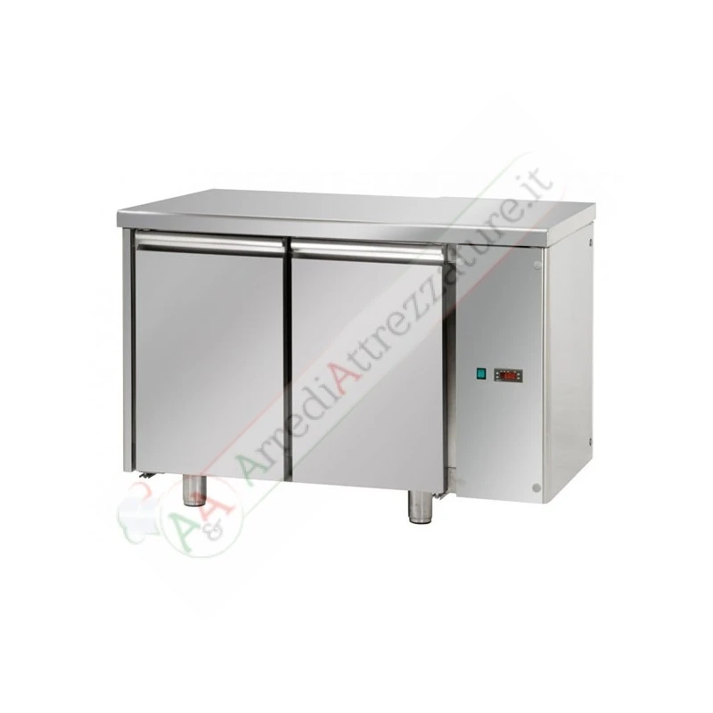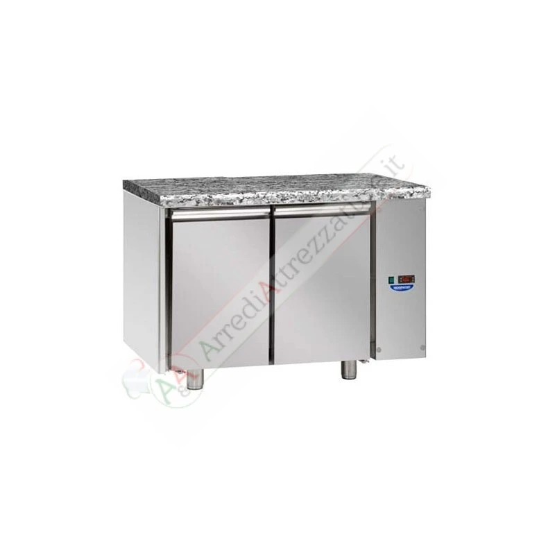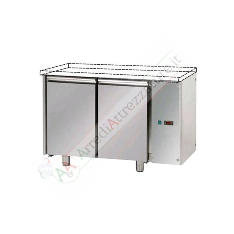 Tavolo congelatore GN I/I predisposto per unità frigorifera remota a bassa temperatura con 2 porte e piano in acciaio inox con varianti con alzatina, senza piano e piano in granito.