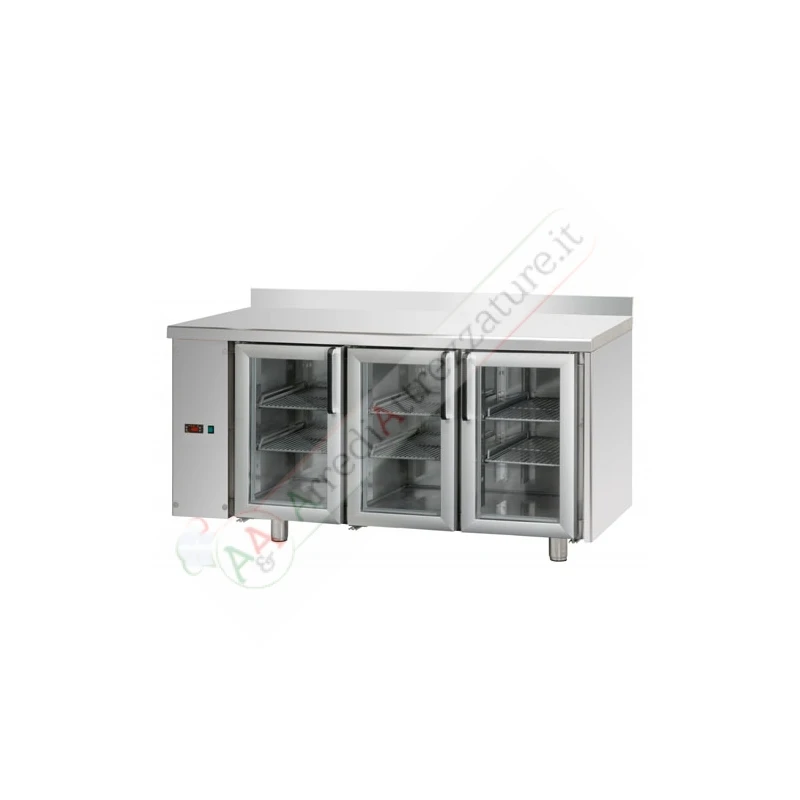 Tavolo refrigerato in acciaio inox 3 porte in vetro con una luce Neon predisposto per unità frigorifera remota nel lato sinistro GN 1/1 in acciaio inox.