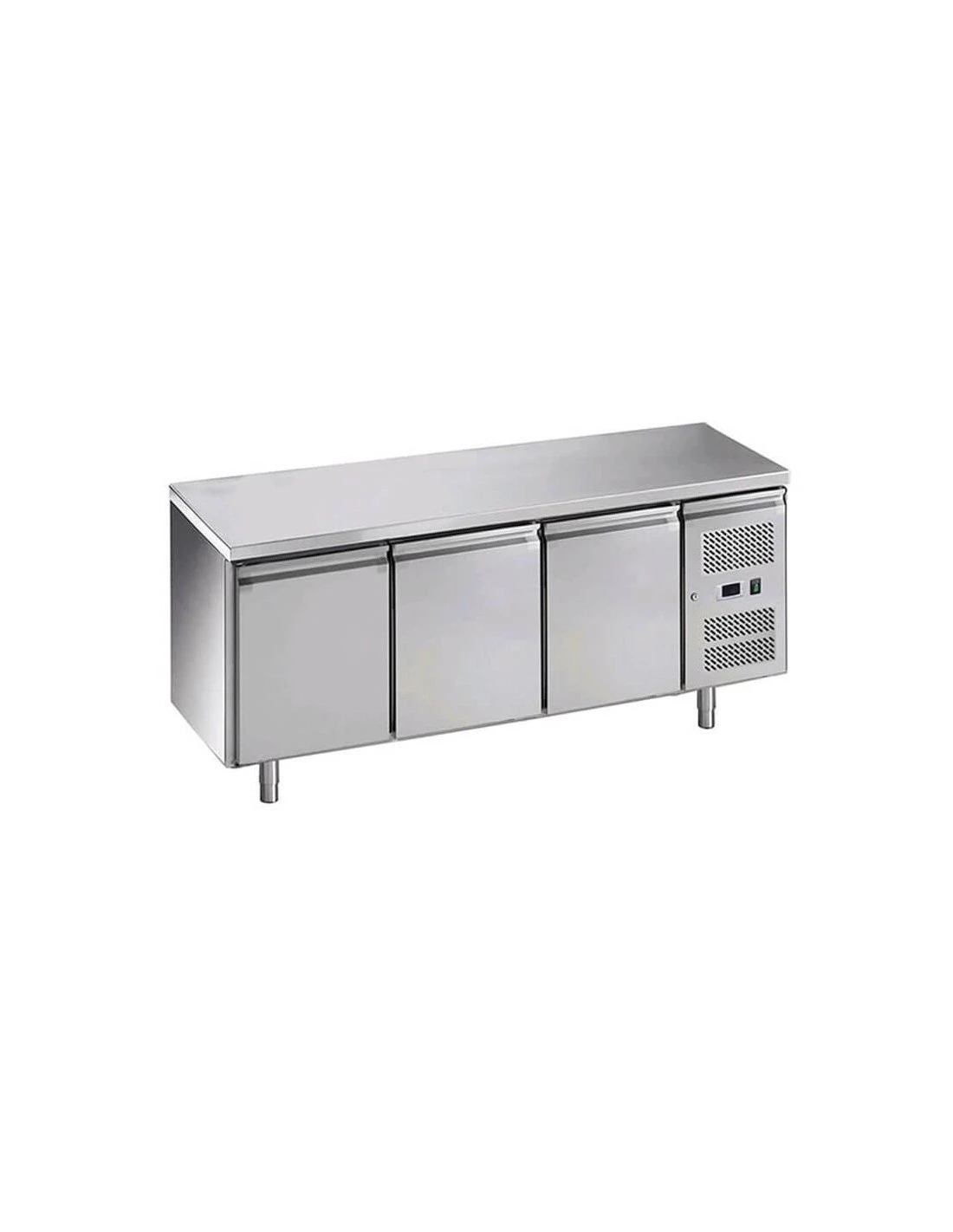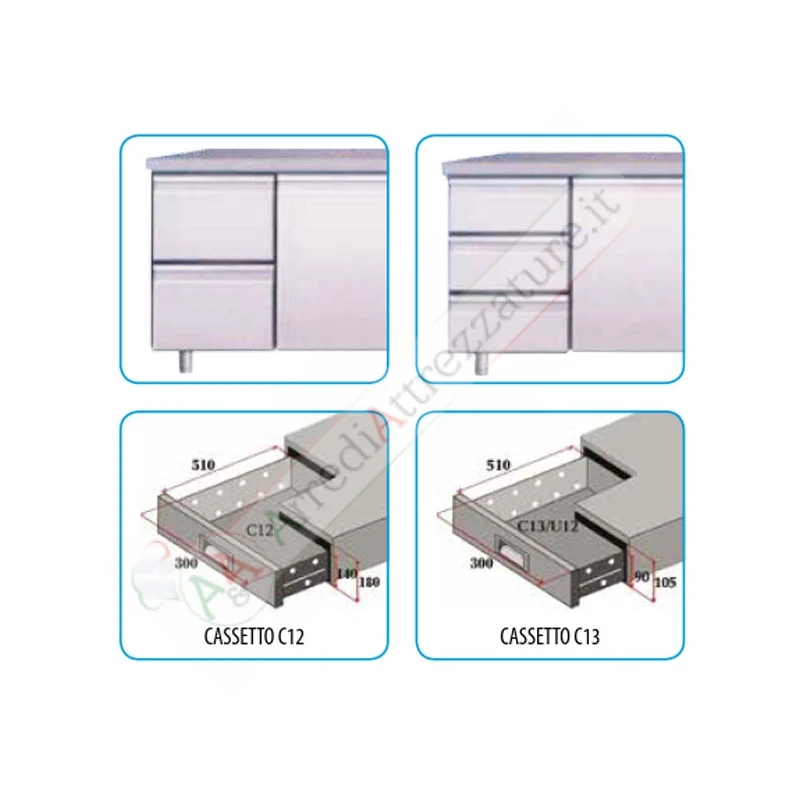 Porta con molla di ritorno. Guarnizione porta estraibile senza utensili. Fondo con angoli arrotondati. Facile intercambiabilità porte con cassettiere da due e tre cassetti. Cassettiere con guide telescopiche in acciaio inox a totale estraibilità. Piedini in acc. Inox regolabili in altezza. Possibilità di appoggiare al muro.