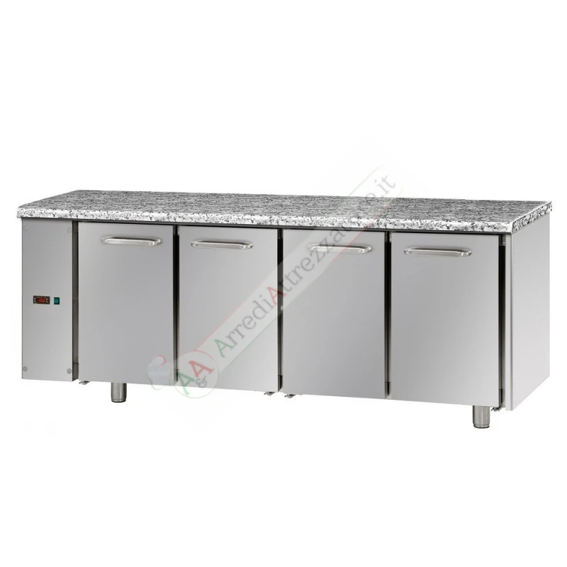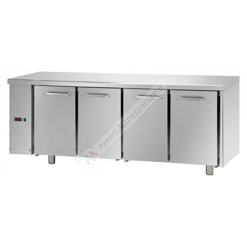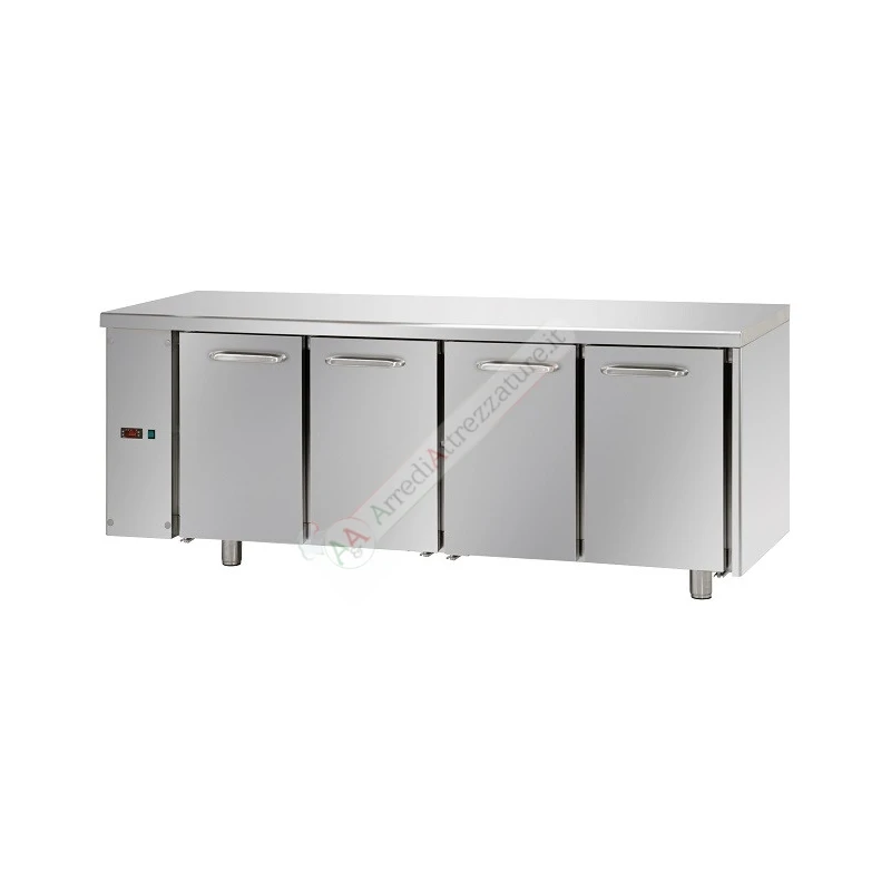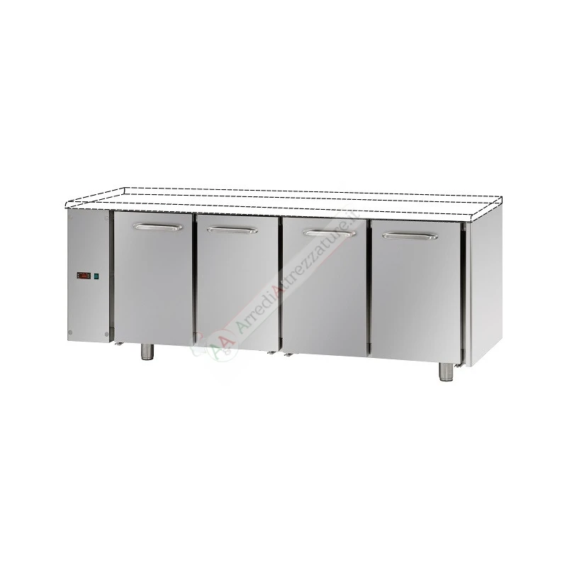 Tavolo refrigerato in acciaio inox 4 porte GN 1/1 predisposto per unità frigorifera remota lato sinistro.