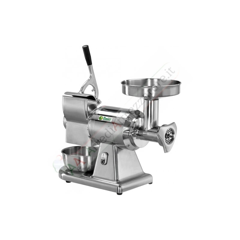 ABBINATO TRITACARNE-GRATTUGIA da banco con una produzione oraria di 160 kg per il tritacarne e di 40 kg per la grattugia. Versione trifase con gruppo macinazione completamente estraibile. ATTENZIONE: L’opzione “Sistema inox Unger” è ordinabile solo con la versione “In acciaio inox”