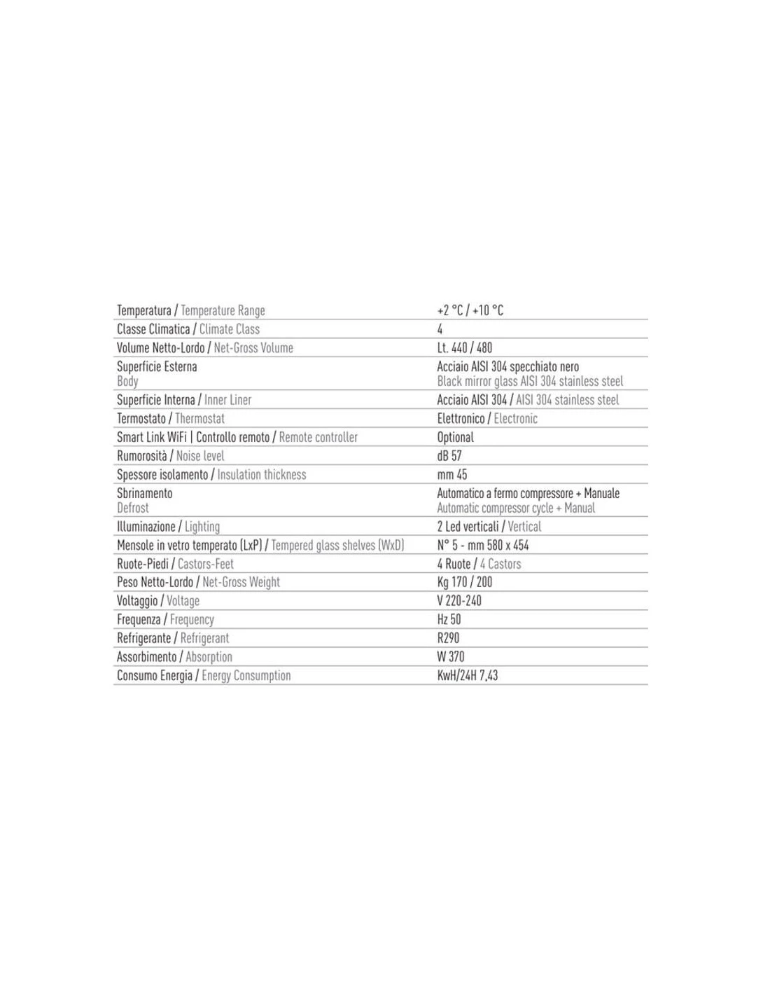 La struttura esterna della vetrina è realizzata in acciaio inossidabile AISI 304 color inox specchiato, conferendo all’unità un aspetto elegante e moderno. Questo materiale è noto per la sua resistenza alla corrosione, assicurando che la vetrina rimanga attraente e durevole nel tempo.