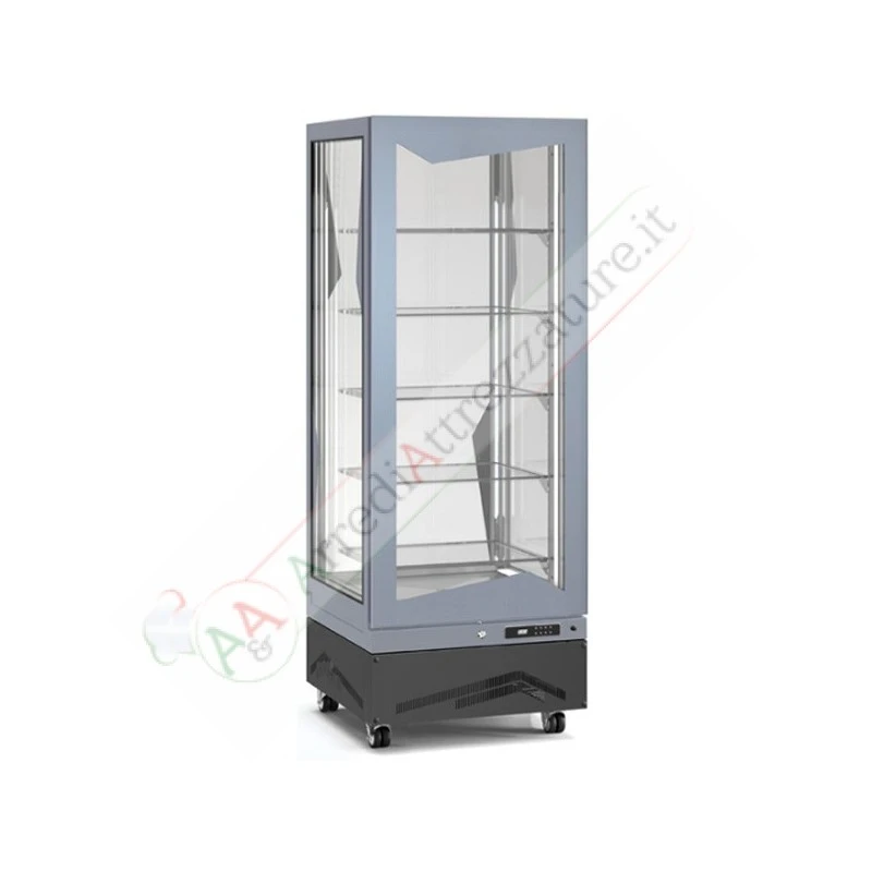 Termodinamica R290 ad alta efficienza. Telaio in alluminio anodizzato nero. Porta con vetrocamera strutturale a bassa emissività, con vetri esterni temperati e serigrafati. Versione cromatica standard: nero. Interno interamente in acciaio AISI 304 inossidabile anticorrosione, con lavorazione al laser e finitura lucida a specchio. Centralina touch screen con retroilluminazione ad alto contrasto. Funzioni termometro, comando dell’illuminazione e modalità ECO integrate. Ampia maniglia “a scomparsa”, integrata nella struttura lungo l’intera altezza della porta. Ruote gemellate pivotanti, di cui due con funzione freno. Serratura di serie.