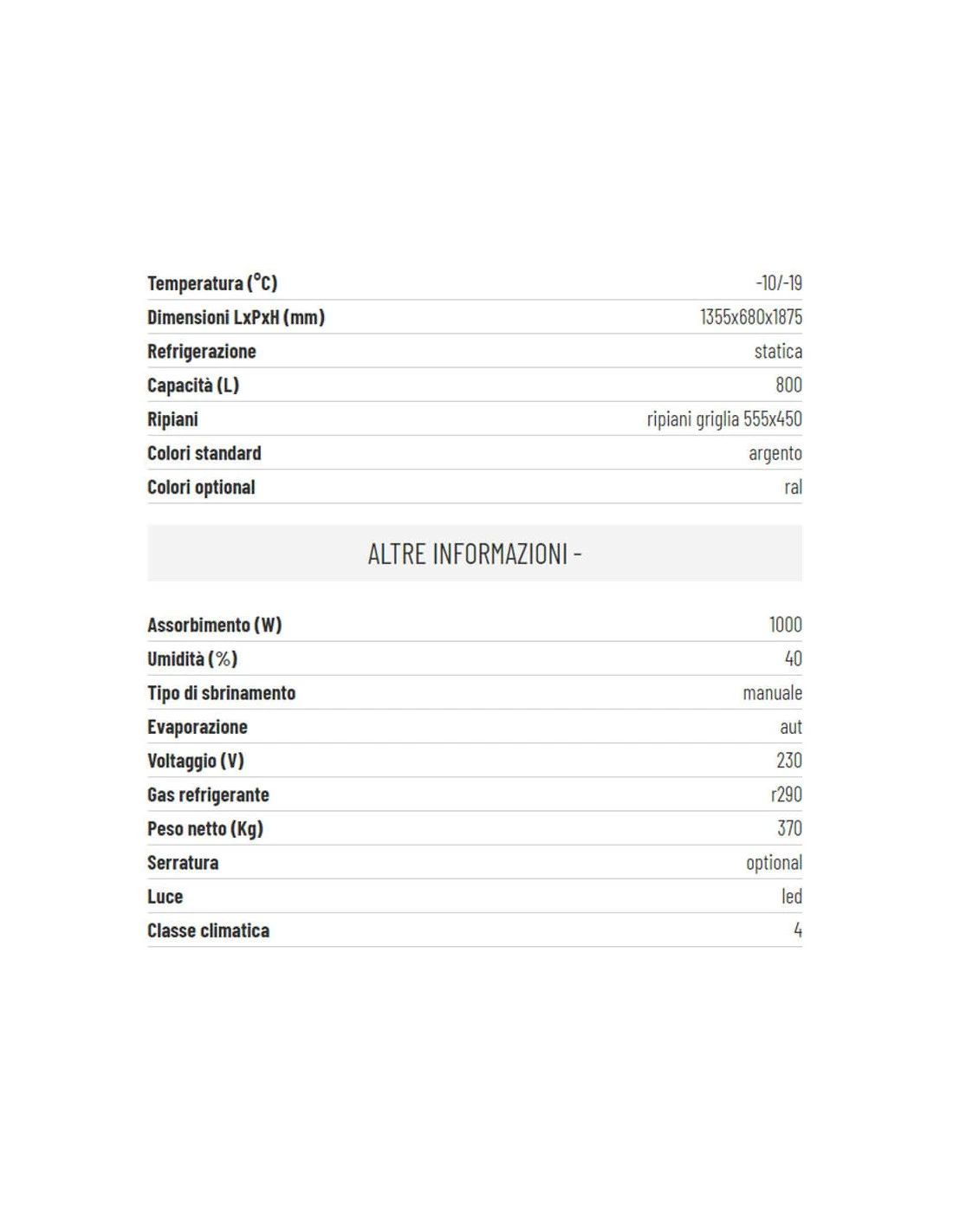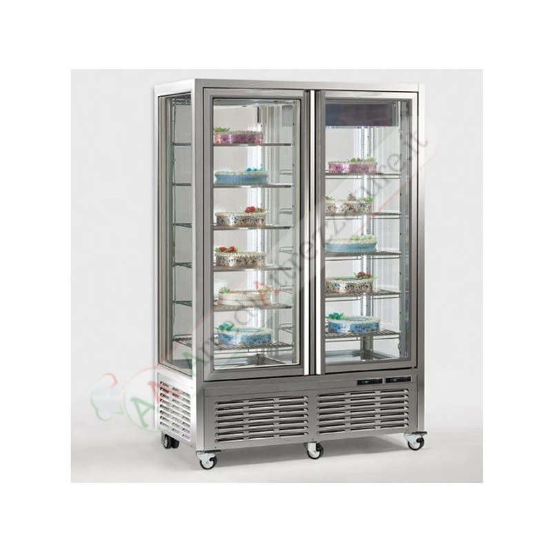 Termodinamica R290 ad alta efficienza. Temperatura di colore LED a scelta: 3.000 K o 6.500 K. Porta autochiudente tramite cerniera oleodinamica. Telaio interamente in alluminio a finitura lucida a specchio (personalizzabile RAL a richiesta), con ampia maniglia monoblocco incorporata in acciaio inox su tutta la lunghezza della porta. Griglie aerazione e fondo interno in acciaio inox rifinito al laser. Doppia vetrocamera a tre lastre su ogni lato, intelaiata e sigillata, con isolamento ad aria secca, per le massime performance di coibentazione. Centralina touch-screen retroilluminata bianca LED con funzione di risparmio energetico. Robuste ruote girevoli, con e senza freno.