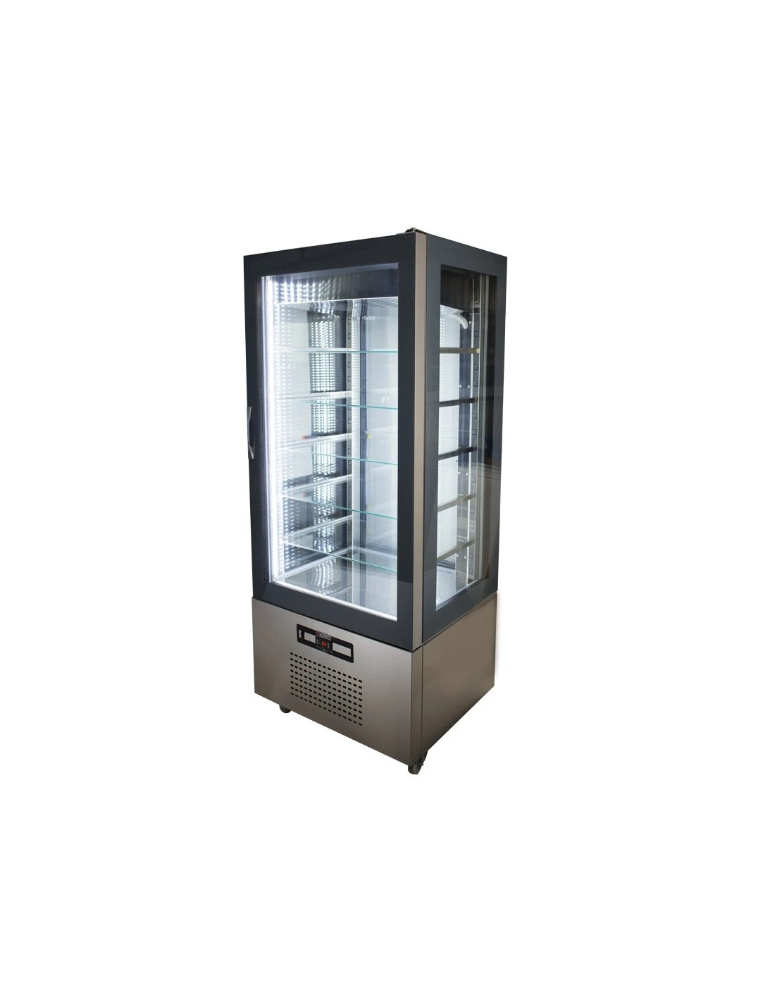 Vetrina verticale refrigerato con una temperatura di esercizio che va da -20 a +5 C°. Questa vetrina refrigerata ha 4 lati in vetro, di cui una è una porta, per una migliore capacità espositiva del prodotto finale, ideale per pasticcerie e gelaterie.