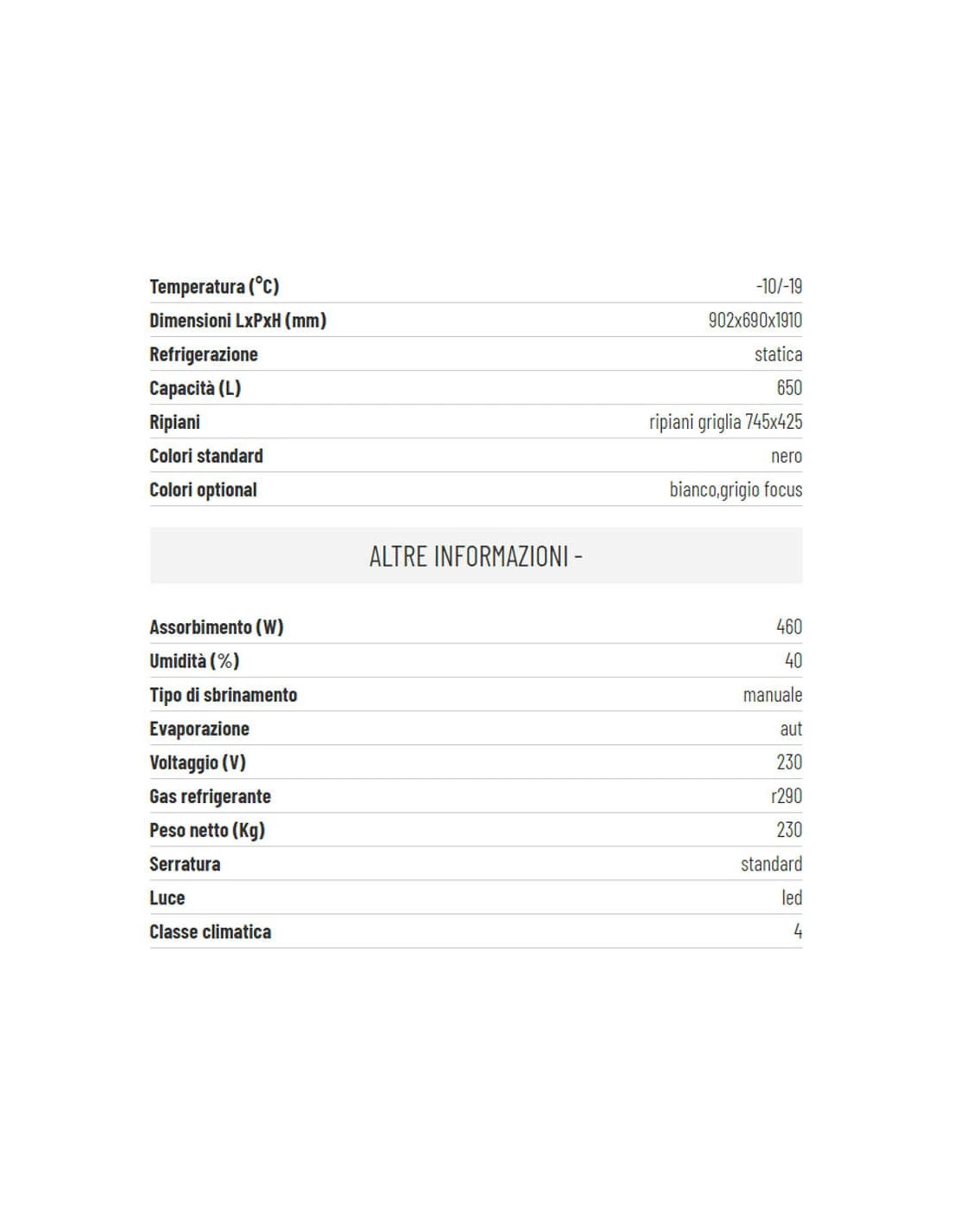 | Caratteristiche | Refrigerazione ventilata. Umidità: 40%. Gas refrigerante: R290. Sbrinamento automatico a gas caldo. |