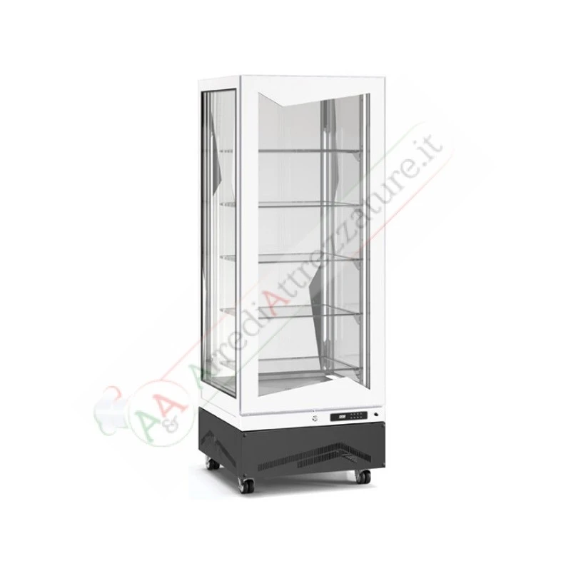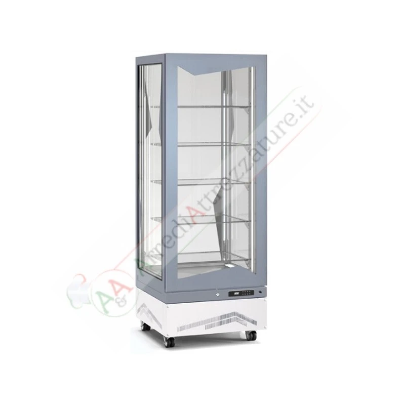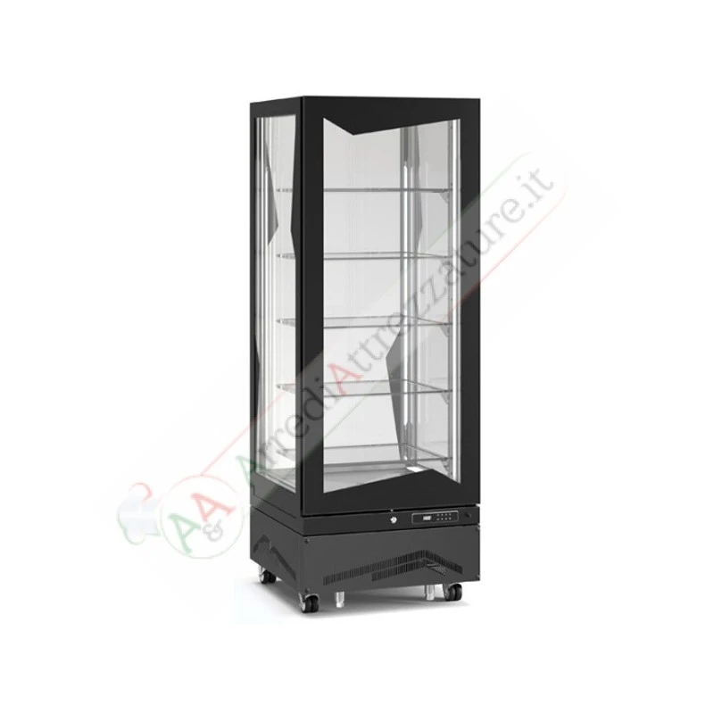 Termodinamica R290 ad alta efficienza. Telaio in alluminio anodizzato nero. Porta con vetrocamera strutturale a bassa emissività, con vetri esterni temperati e serigrafati. Versione cromatica standard: nero. Interno interamente in acciaio AISI 304 inossidabile anticorrosione, con lavorazione al laser e finitura lucida a specchio. Centralina touch screen con retroilluminazione ad alto contrasto. Funzioni termometro, comando dell’illuminazione e modalità ECO integrate. Ampia maniglia “a scomparsa”, integrata nella struttura lungo l’intera altezza della porta. Ruote gemellate pivotanti, di cui due con funzione freno. Serratura di serie.