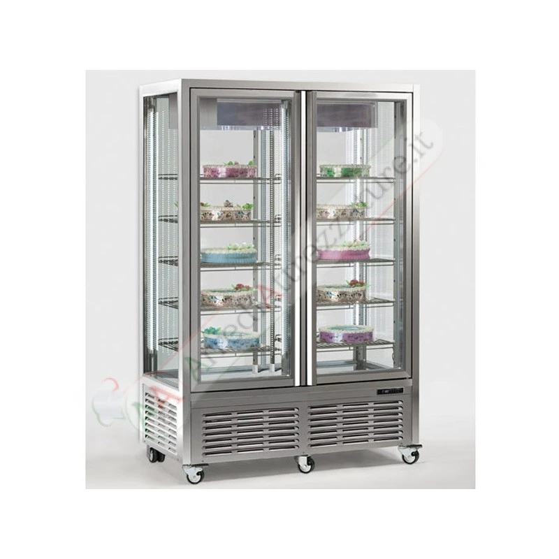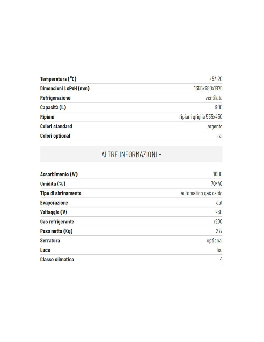 Termodinamica R290 ad alta efficienza. Temperatura di colore LED a scelta: 3.000 K o 6.500 K. Porta autochiudente tramite cerniera oleodinamica. Telaio interamente in alluminio a finitura lucida a specchio (personalizzabile RAL a richiesta), con ampia maniglia monoblocco incorporata in acciaio inox su tutta la lunghezza della porta. Griglie aerazione e fondo interno in acciaio inox rifinito al laser. Doppia vetrocamera a tre lastre su ogni lato, intelaiata e sigillata, con isolamento ad aria secca, per le massime performance di coibentazione. Centralina touch-screen retroilluminata bianca LED con funzione di risparmio energetico. Robuste ruote girevoli, con e senza freno.