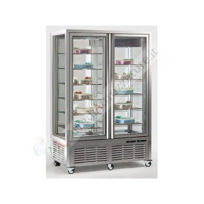 Termodinamica R290 ad alta efficienza. Temperatura di colore LED a scelta: 3.000 K o 6.500 K. Porta autochiudente tramite cerniera oleodinamica. Telaio interamente in alluminio a finitura lucida a specchio (personalizzabile RAL a richiesta), con ampia maniglia monoblocco incorporata in acciaio inox su tutta la lunghezza della porta. Griglie aerazione e fondo interno in acciaio inox rifinito al laser. Doppia vetrocamera a tre lastre su ogni lato, intelaiata e sigillata, con isolamento ad aria secca, per le massime performance di coibentazione. Centralina touch-screen retroilluminata bianca LED con funzione di risparmio energetico. Robuste ruote girevoli, con e senza freno.